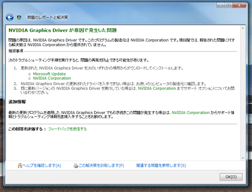 そしてそのまま強制的に再起動してしまいました。原因はNVIDIAのビデオカードのドライバーのようで、これはOSをセットアップしたときに自動で入っていたものをそのまま使っていたので、それが問題だったみたいです。仕方なく最新のドライバーを落としてみましたが、安定するどころかまともに動かなくなってしまった。ウィンドをドラックしただけだでOSごと落ちてしまったり、Aeroの動作が重くなってしまったりと7600GSでは最新のドライバーはどうも合わないようです。