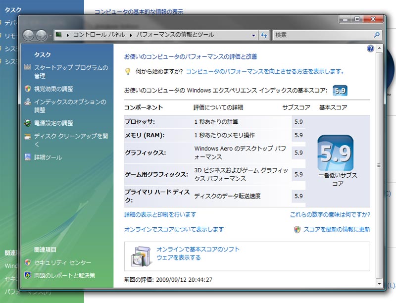 あと夏ごろにWUXGAのモニターを2台になっているのでそのおかげでAeroの動作が重くなっているようです。現にAeroのスコアが以前Vistaをインストールしたときに比べ「4.8」あったのがモニターを変えてから「4.4」になっていたので、解像度が上がったためパフォーマンスが落ちたようです。 |